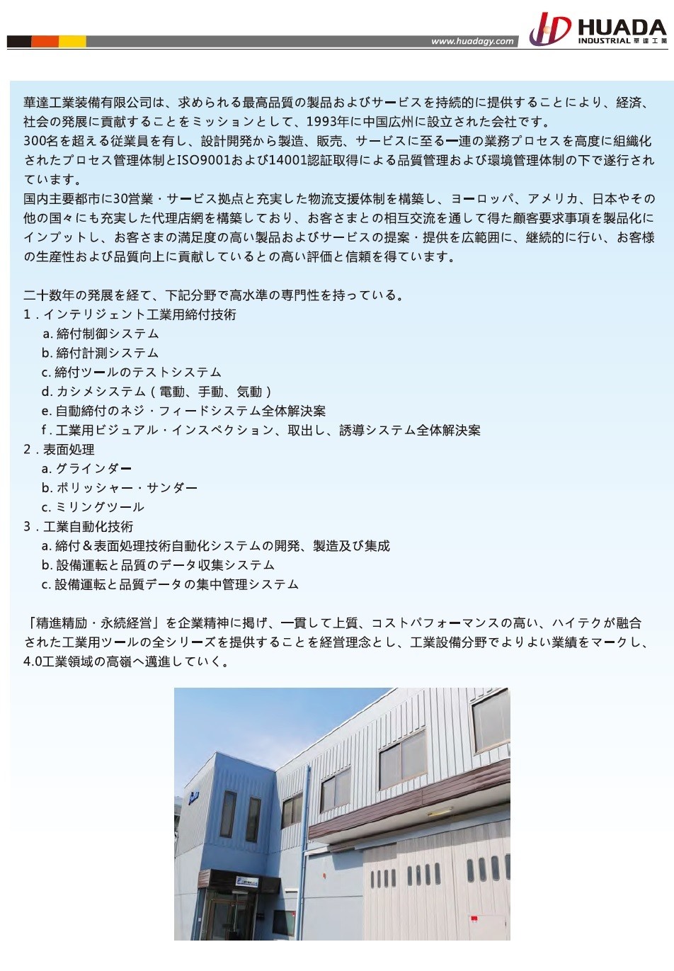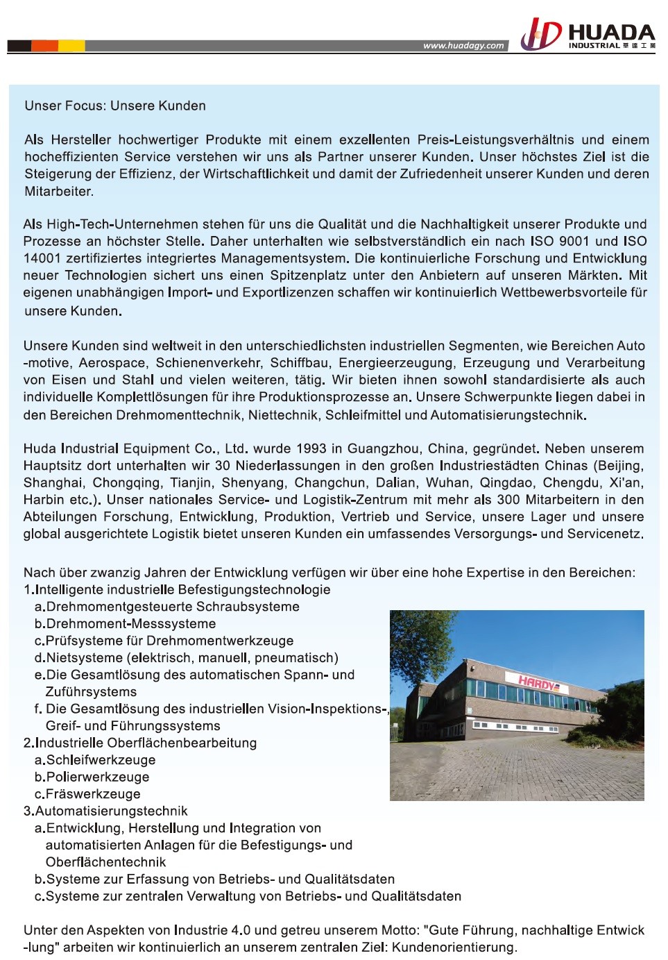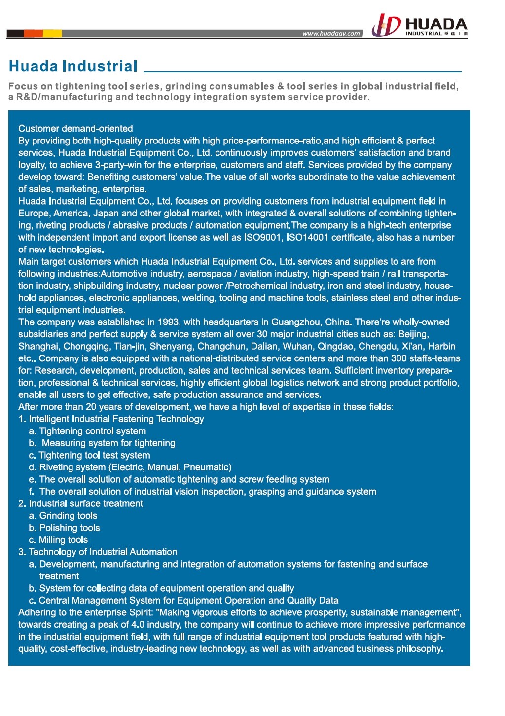 廣州市華達工業裝備有限公司(簡稱華達工業裝備有限公司)成立于1993年,是專注于全球工業領域擰緊工具系列和研磨耗材和工具系列 研發制造 與技術集成系統服務供應商